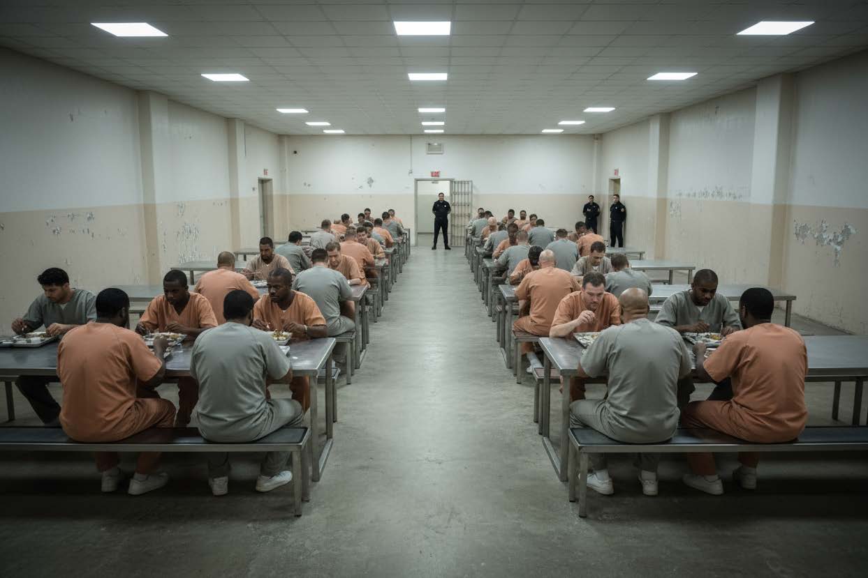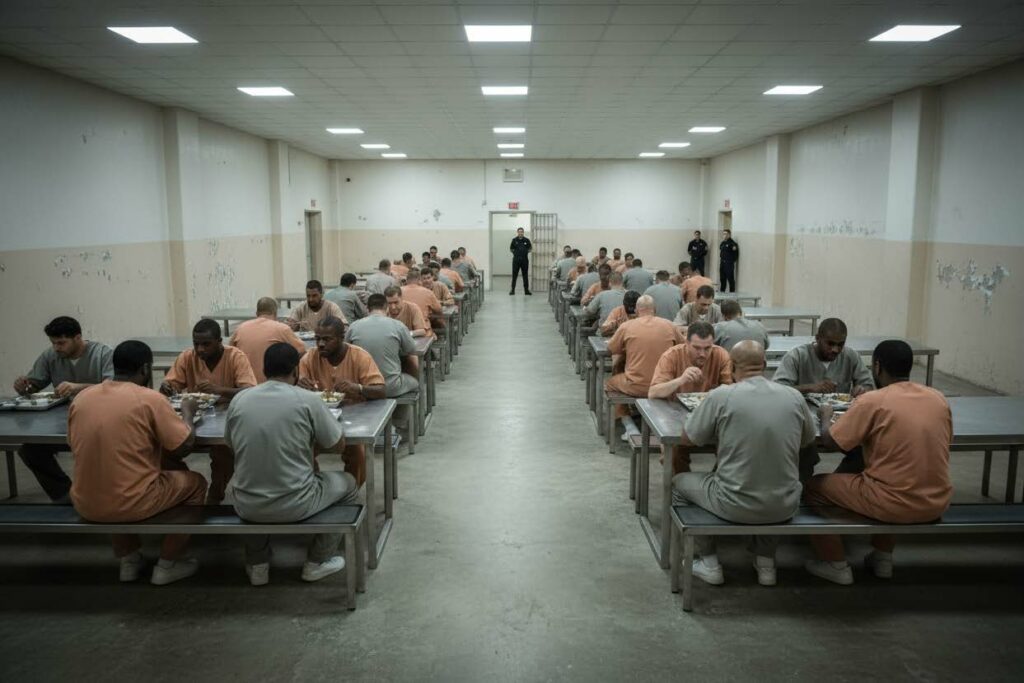 - Prompt : « génère moi une image qui représente les détenus d’une prison à l’heure de table. »