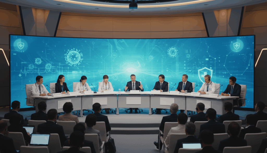 Une quarantaine de personnes, pour la plupart des hommes en costume-cravate, à l’exception d’une seule femme au centre de la photo, semblant représenter des Etats occidentaux ou d’Asie de l’Est. On note aussi les petits nuages en carton coloré pour représenter le climat et les drapeaux inventés 🤭